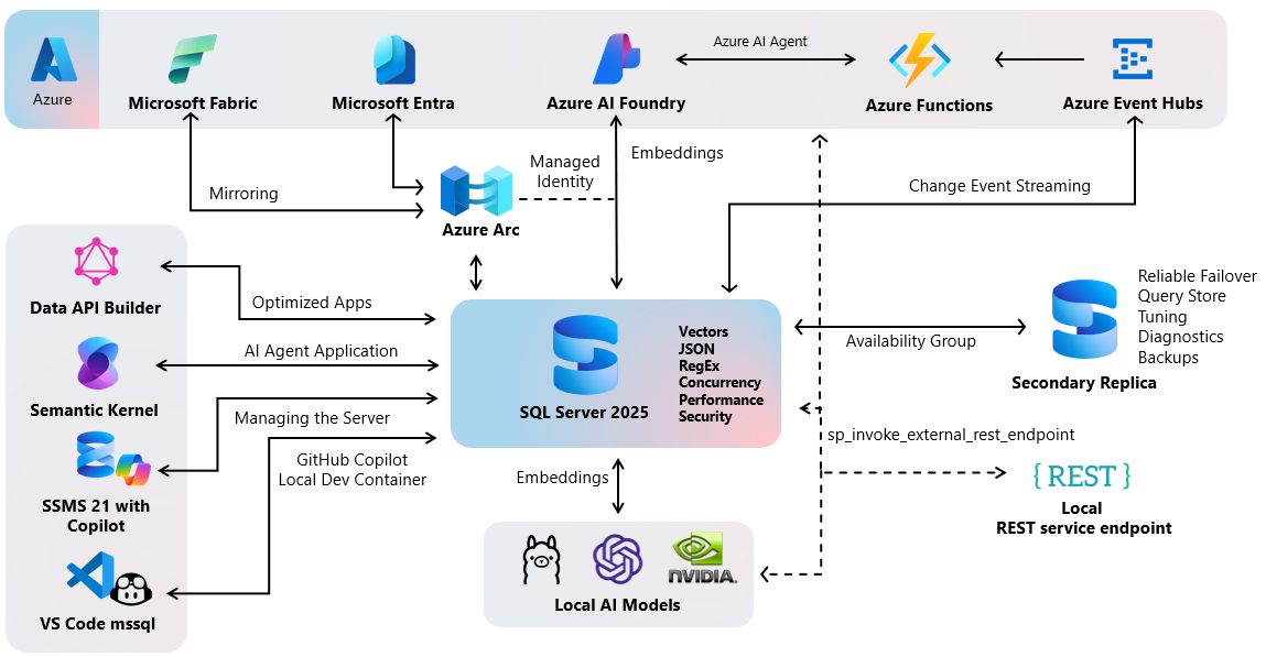 SQL Server 2025 zavádí funkce AI přímo do databázového stroje. Tato verze vkládá funkce, jako jsou datové typy nativních vektorů, generování vkládání a připojení k Azure OpenAI a dalším architekturám, což organizacím umožňuje implementovat sémantické vyhledávání a vytvářet aplikace AI pomocí T-SQL.