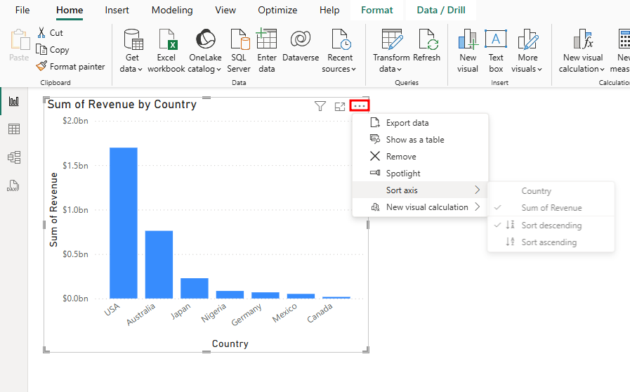 Výběr tří teček (...) Nachází se v pravém horním rohu vizuálu (nebo mohou být tři tečky v dolní části grafu). Osu můžete seřadit podle země. Prozatím neprovádějte žádné změny.