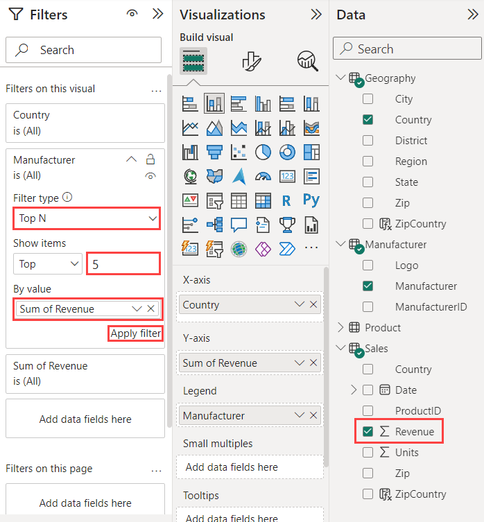 Všimněte si, že vizuál je filtrovaný tak, aby zobrazoval prvních pět výrobců podle součtu výnosů. Výrobce VanArsdel, Ltd. má vyšší procento prodejů v Austrálii ve srovnání s jinými zeměmi nebo regiony.