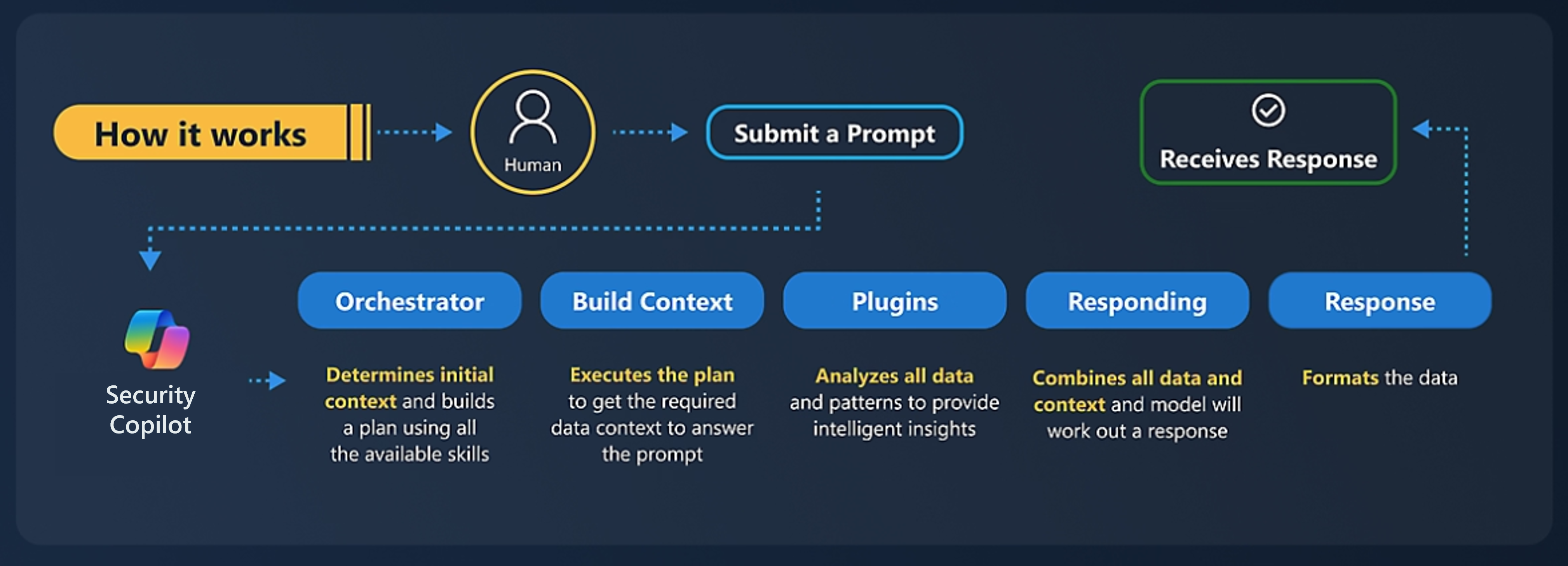 Takže když teď existuje základní znalost modulů plug-in, funkcí a způsobu interakce uživatele s Microsoft Security Copilot prostřednictvím výzev, stojí za to podívat se, jak tyto komponenty spolupracují, aby zpracovali výzvu a pomohli analytikům zabezpečení.