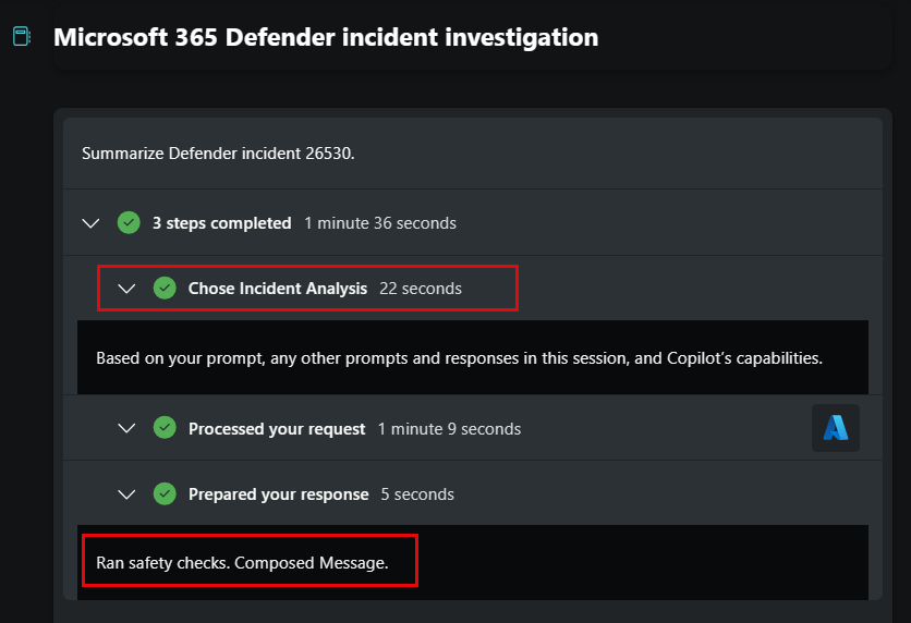 Během tohoto procesu copilot vygeneruje protokol procesu, který je viditelný pro uživatele. Uživatel může zjistit, jakou schopnost se používá k vygenerování odpovědi. To je důležité, protože umožňuje uživateli určit, jestli byla odpověď vygenerována z důvěryhodného zdroje. Na následujícím snímku obrazovky ukazuje protokol procesu, že Copilot zvolil možnost Analýza incidentu. Protokol procesů také ukazuje, že konečný výstup procházel bezpečnostními kontrolami, což je součástí závazku Microsoftu k zodpovědné umělé inteligenci.