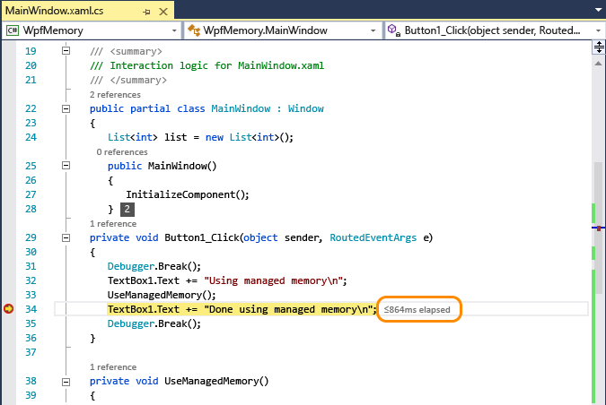 Když ladicí program zastaví provádění na bodu přerušení nebo při krokování, uplynulý čas mezi tímto a předchozím bodem přerušení se zobrazí jako tip v okně editoru. Další informace naleznete v tématu PerfTips: Informace o výkonu na první pohled při ladění pomocí sady Visual Studio.