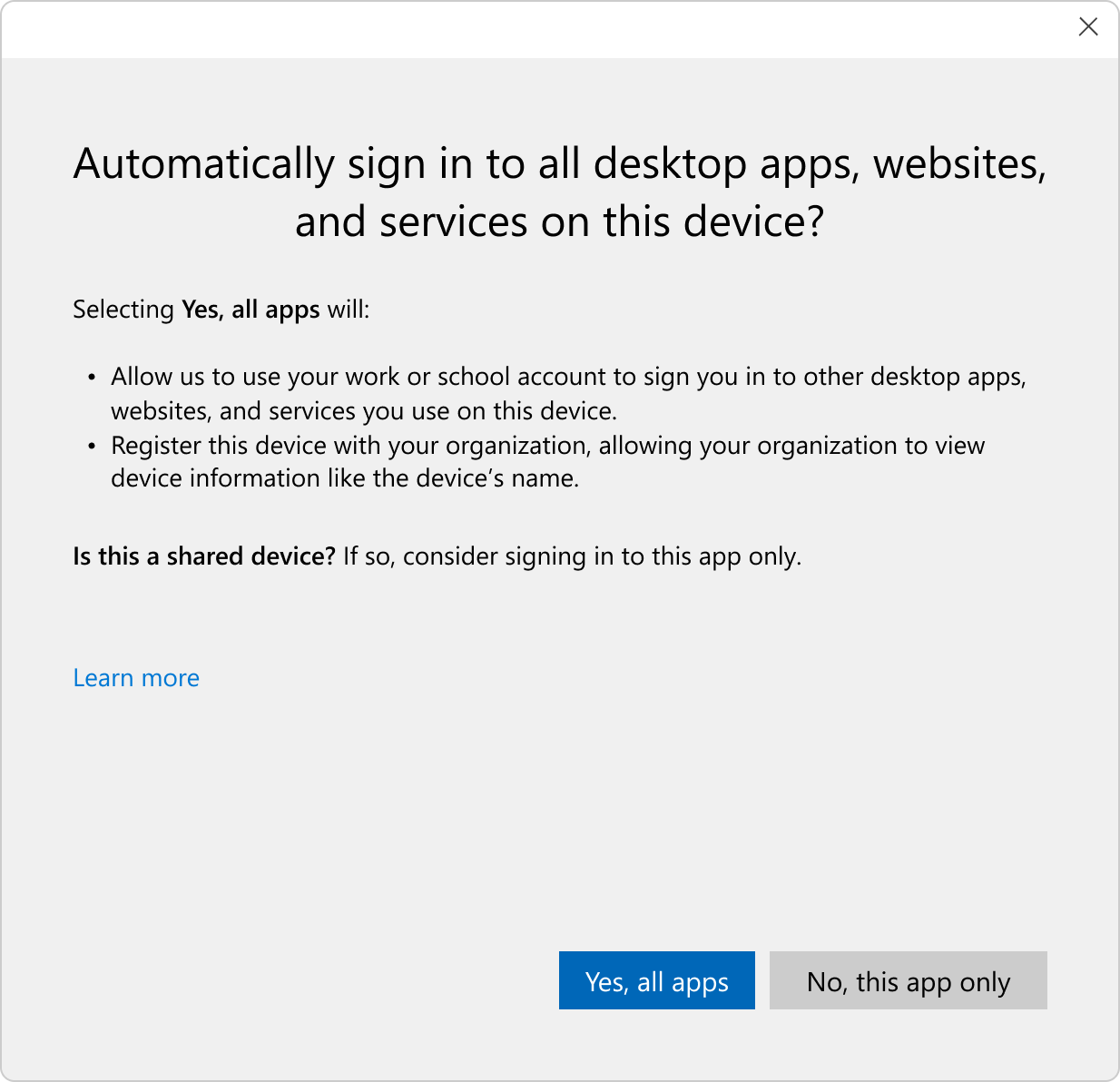 Organizations can deploy Microsoft Entra ID joined devices to enable access to both cloud and on-premises apps and resources. Access to resources can be controlled based on the Microsoft Entra ID account and Conditional Access policies applied to the device. For the most seamless and streamlined end-to-end single sign-on (SSO) experience, we recommend users configure Windows Hello for Business during the out-of-box experience for easy passwordless sign-in to Entra ID.