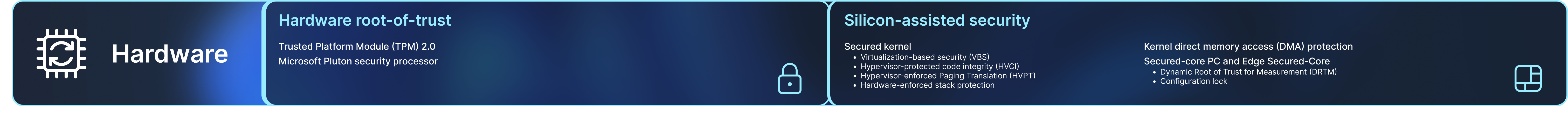In addition to a modern hardware root-of-trust, there are multiple capabilities in the latest chips that harden the operating system against threats. These capabilities protect the boot process, safeguard the integrity of memory, isolate security-sensitive compute logic, and more.