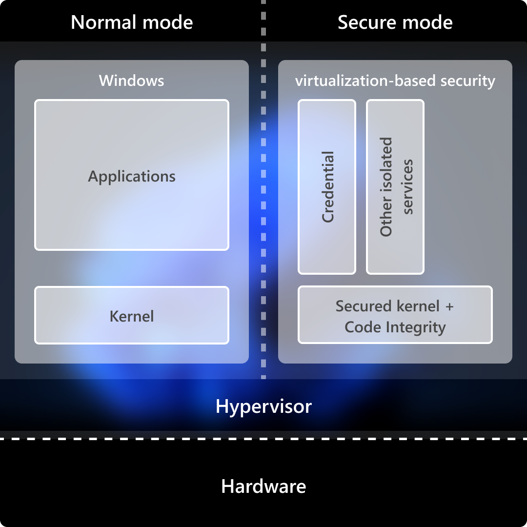 Virtualization-based security (VBS), also known as core isolation, is a critical building block in a secure system. VBS uses hardware virtualization features to host a secure kernel separated from the operating system. This separation means that even if the operating system is compromised, the secure kernel remains protected. The isolated VBS environment protects processes, such as security solutions and credential managers, from other processes running in memory. Even if malware gains access to the main OS kernel, the hypervisor and virtualization hardware help prevent the malware from executing unauthorized code or accessing platform secrets in the VBS environment. VBS implements virtual trust level 1 (VTL1), which has higher privilege than the virtual trust level 0 (VTL0) implemented in the main kernel.