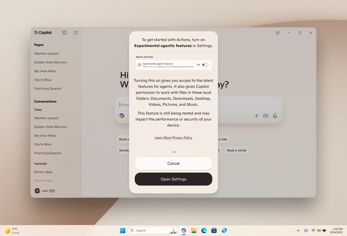 As AI-powered agents become integral to how we work and create, Windows is committed to making these experiences more productive and secure for individuals and enterprises. Recently, we announced Making Every Windows 11 PC an AI PC that make powerful AI easy on Windows 11. One of the new experiences we introduced is an experimental feature called Copilot Actions. Copilot Actions on Windows 11 builds on our announcement in May, where we announced Copilot Actions on the web allowing Copilot to take real actions on your behalf, like booking a table at your favorite restaurant or ordering groceries.