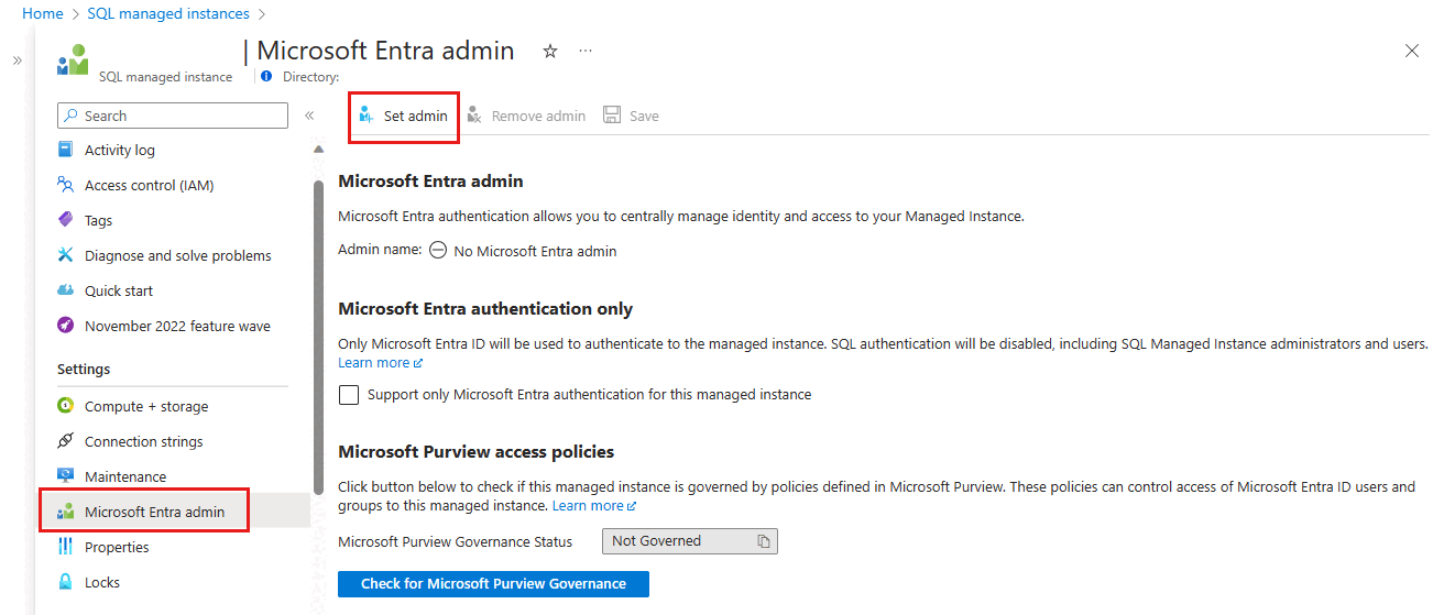 On the Microsoft Entra ID pane, select Set admin to open the Microsoft Entra ID pane.
