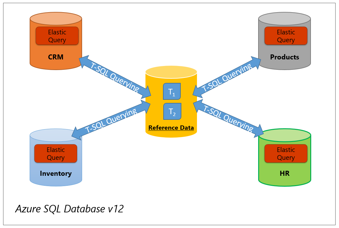 Cross-database querying: Elastic queries enable use cases that require querying across several databases in SQL Database. Figure 3 shows four different databases: CRM, Inventory, HR, and Products. Queries performed in one of the databases also need access to one or all the other databases. Using an elastic query, you can configure your database for this case by running a few simple DDL statements on each of the four databases. After this one-time configuration, access to a remote table is as simple as referring to a local table from your T-SQL queries or from your BI tools. This approach is recommended if the remote queries don't return large results.