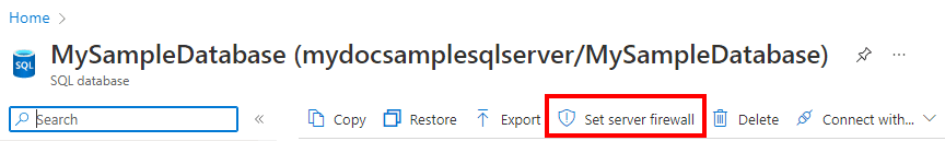 To set a server-level IP firewall rule from the database overview page, select Set server firewall on the toolbar, as the following image shows.