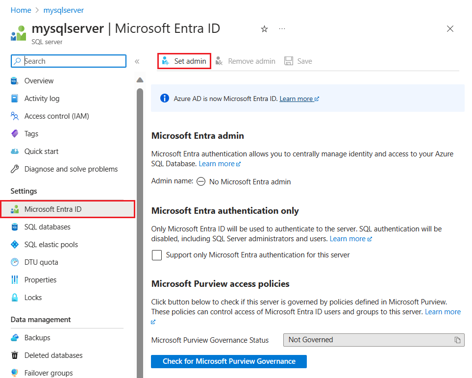 In the Azure portal, on the SQL server page, select Microsoft Entra ID from the resource menu, then select Set admin to open the Microsoft Entra ID pane.