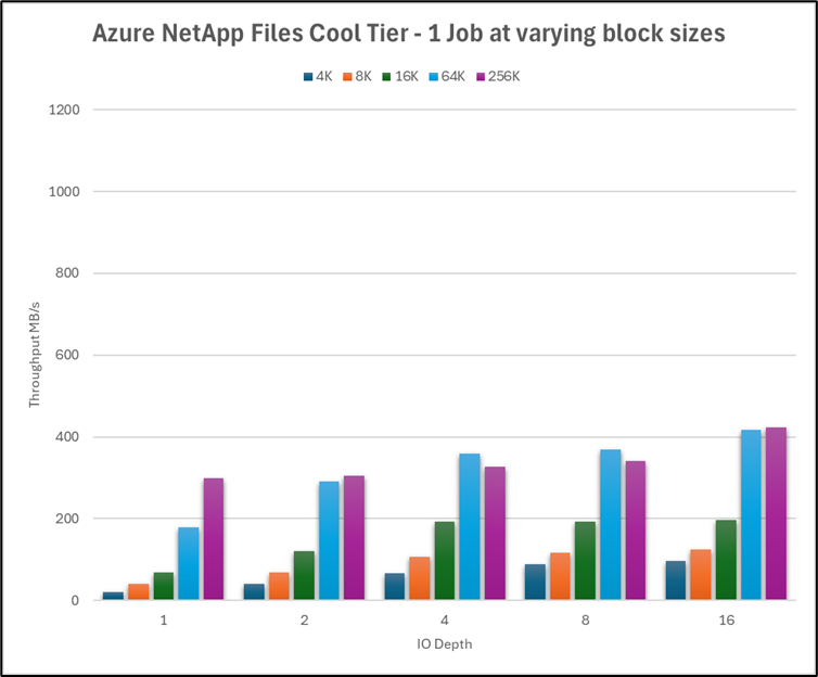 The following graph shows the cool tier performance for this test using a variety of queue depths. The maximum throughput for a single VM was approximately 400 MiB/s.