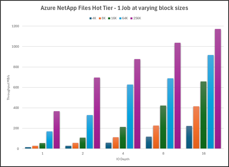 In the following scenario, a single job on one D32_V5 virtual machine (VM) was used on a 50-TiB Azure NetApp Files volume using the Ultra performance tier. Different block sizes were used to test performance on hot and cool tiers.