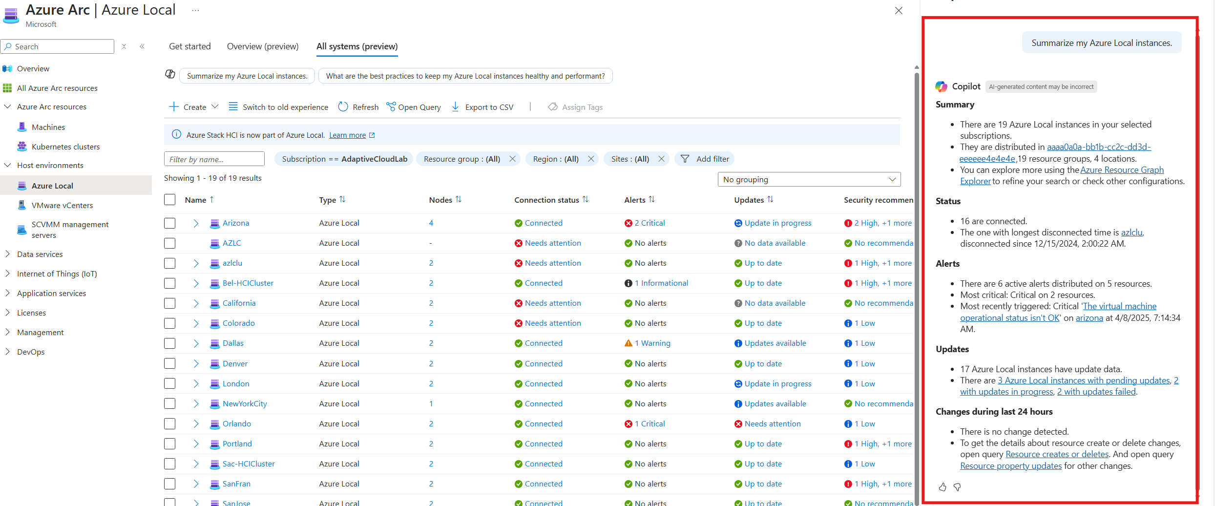 Azure Copilot can help you identify problems and get information about your Azure Local instances.