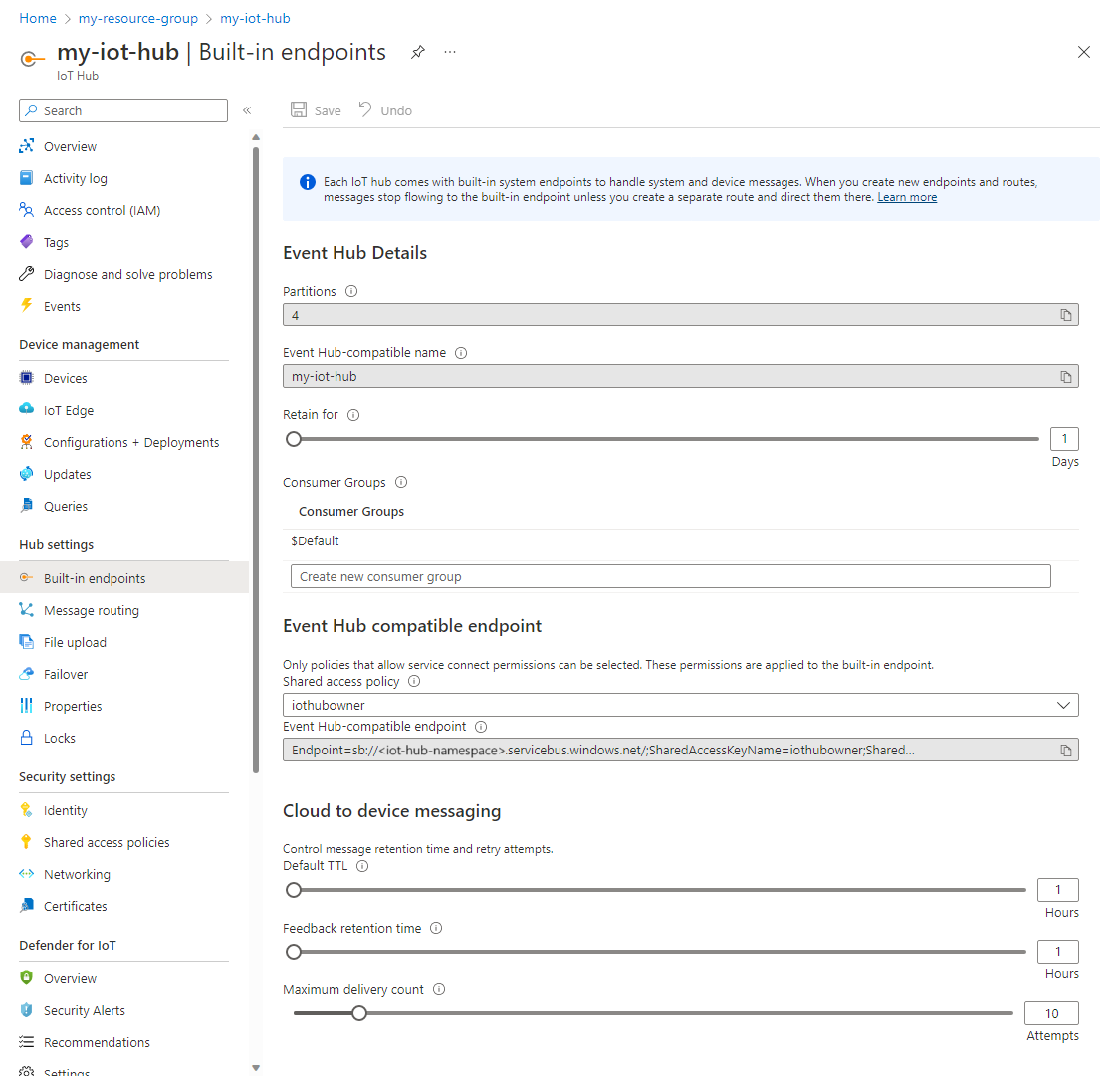- The Cloud to device messaging section contains the following values: Default TTL, Feedback retention time, and Maximum delivery count.