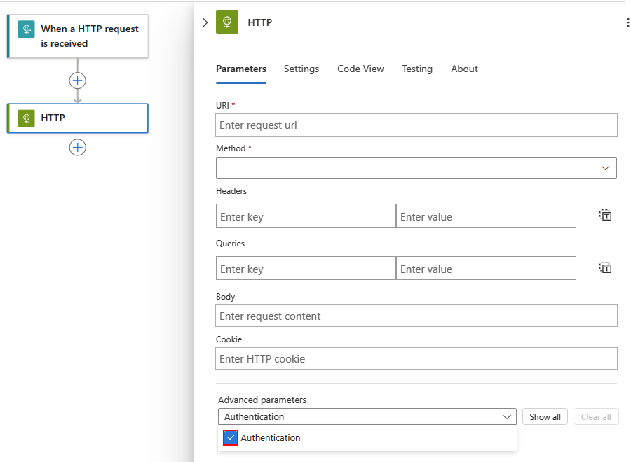 authenticationobject. If noidentityproperty exists in thisauthenticationobject, the logic app implicitly uses the system-assigned identity.Add an