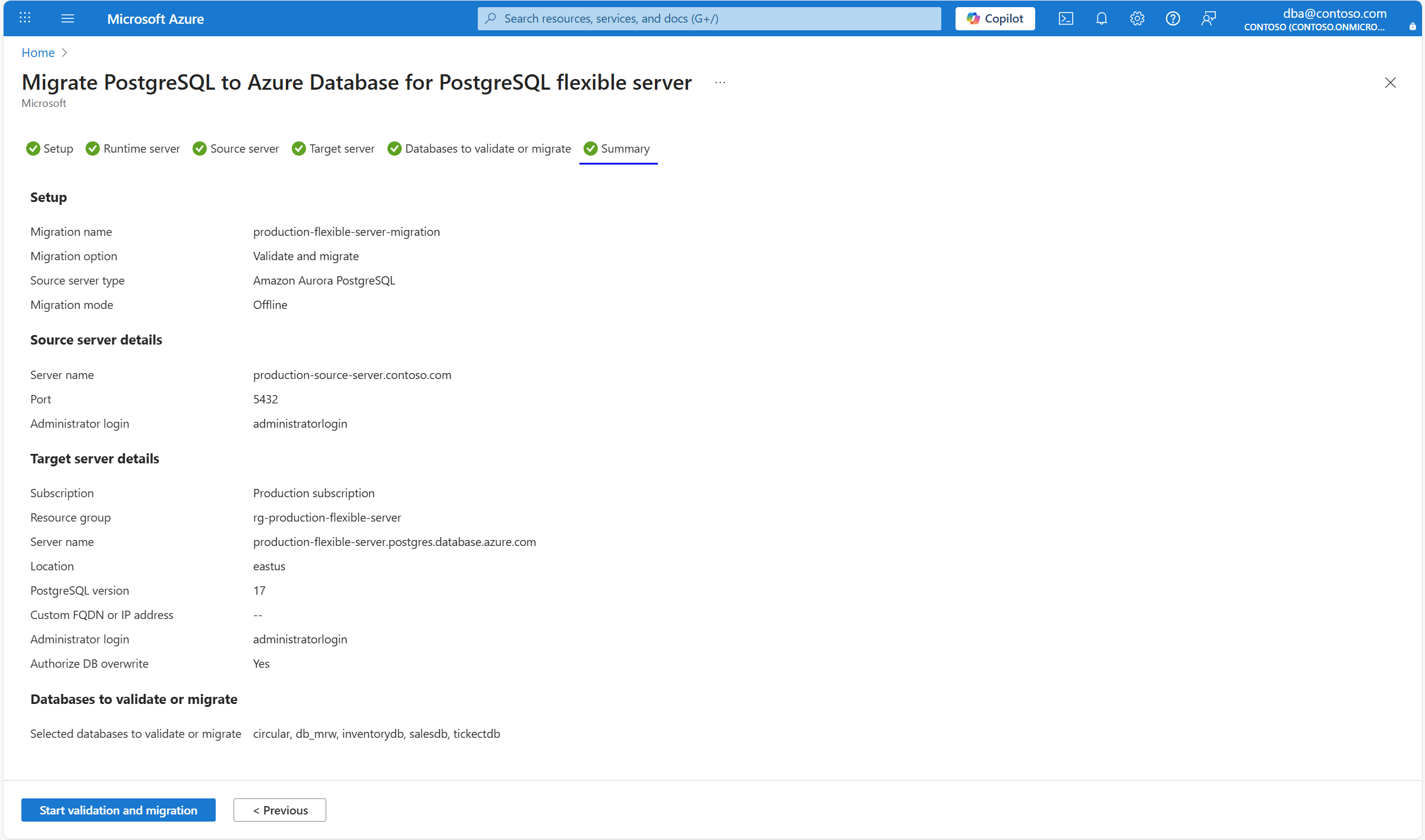 The Summary tab summarizes all the source and target details for creating the validation or migration. Review the details and select Start validation and migration.