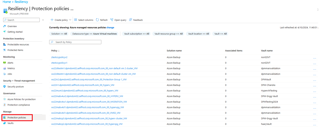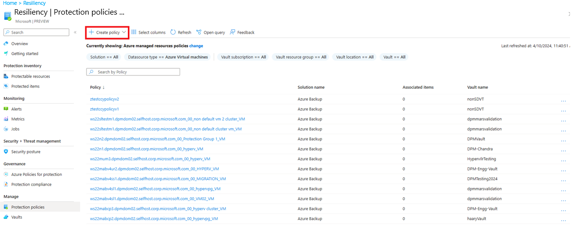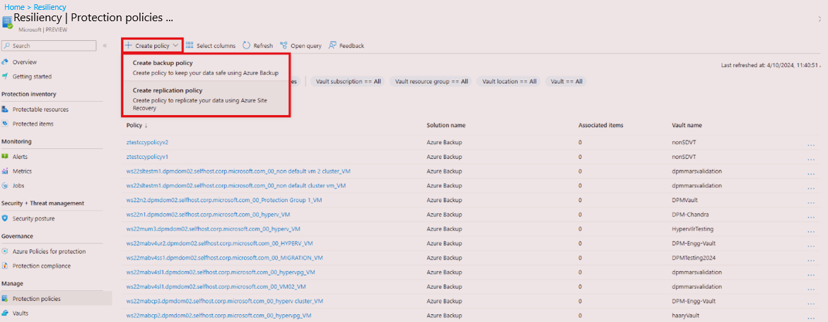 After the vault is created, it appears in the list of vaults as part of the Resiliency experiences. If the vault doesn't appear, select Refresh.