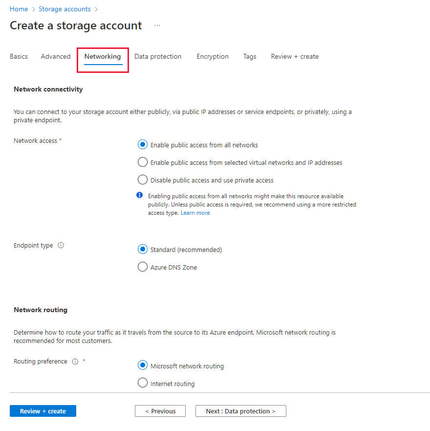 On the Networking tab, you can configure network connectivity and routing preference settings for your new storage account. These options can also be configured after the storage account is created.