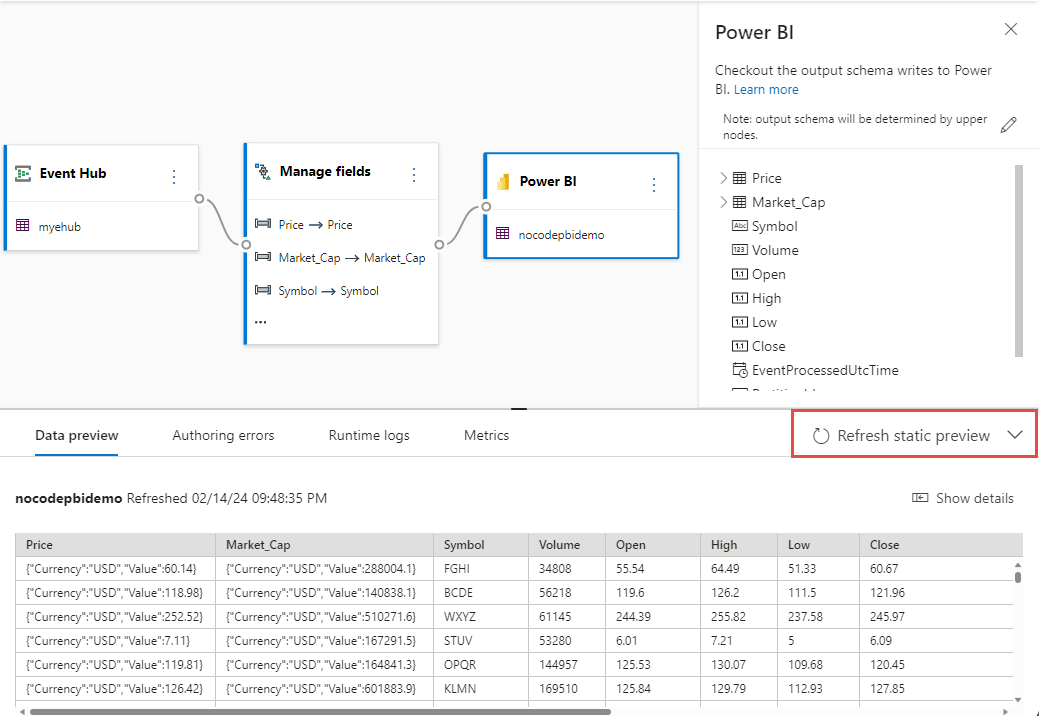 Optionally, select Get static preview/Refresh static preview to see the data preview that will be ingested in event hub.