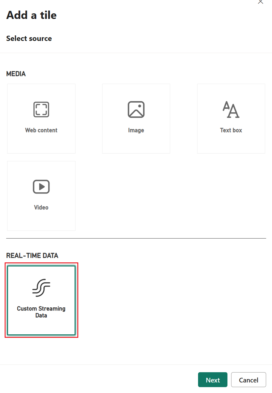 - Once the new dashboard is created, you'll be led to the new dashboard. Select Edit, and choose + Add a tile in the top menu bar. A right pane is open. Select Custom Streaming Data to go to next page.