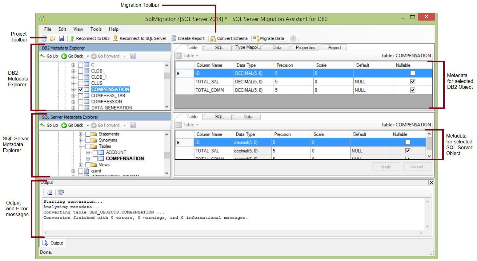 After SSMA is installed, you can use SSMA to migrate Db2 databases to SQL Server. It helps to become familiar with the SSMA user interface before you start. The following diagram shows the user interface for SSMA, including the metadata explorers, metadata, toolbars, output pane, and error list pane: