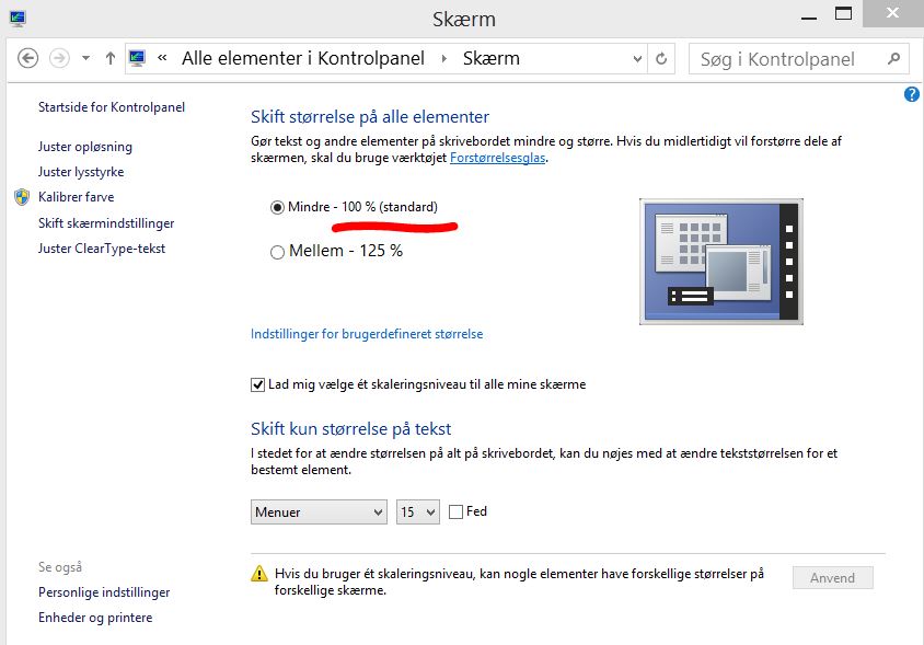 Hvis højre klikker på skrivebordet og vælger personalisere og vælge skærm - her inde kan du ændre en del indstillinger.