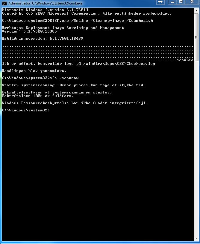 Husk mellemrum, da forkerte mellemrum kan påvirke resultatet. Det letteste er normalt at kopiere og indsætte kommandoerne, en ad gangen, i stedet for at taste dem. Det kan tage noget tid at køre dette program, så vær tålmodig. Når programmet er klart, så kommer der en rapport om registrerede fejl og hvorvidt det kunne reperere dem.