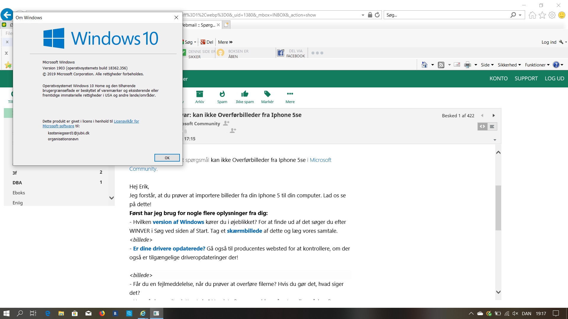 - Hvilken version af Windows kører du i øjeblikket? For at finde ud af det søger du efter WINVER i Søg ved siden af Start. Tag et skærmbillede af dette og læg vores samtale.