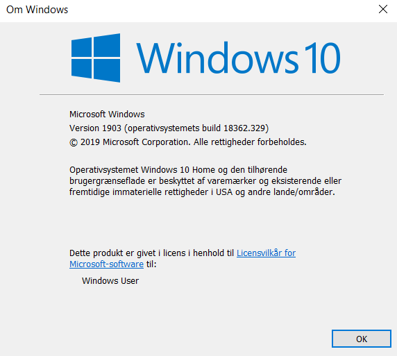 - Hvilken version af Windows has du? (Du kan finde din version ved at, åbne start menuen > skriv winver > tryk på enter. Så vil følgende vindue komme frem).