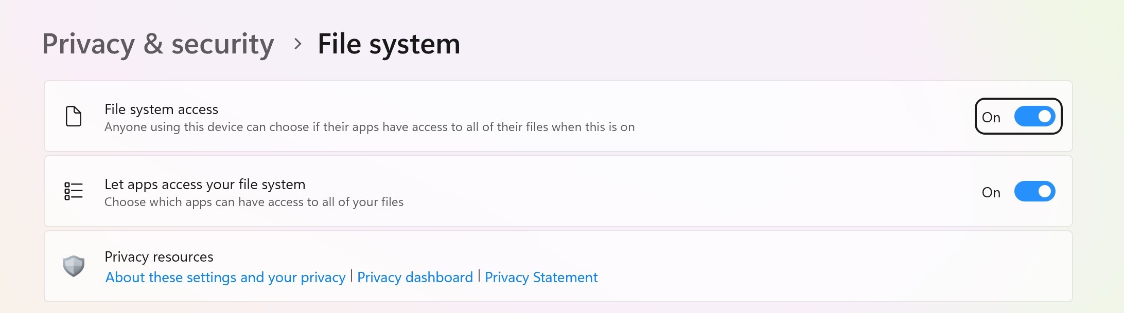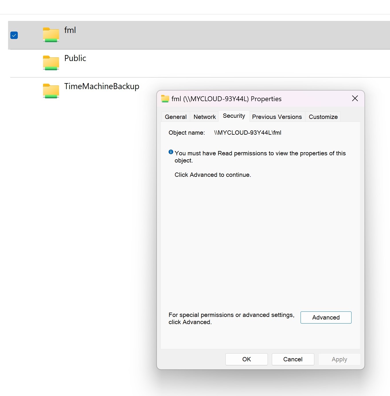 Hvad mangler der opsat eller valgt i sikkerheden på Windows 11 Pro for at brugeren kan få adgang til sin "fml"-mappe?