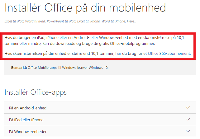 Og så til Office på din mobil. Jeg har her, denne artikel du kan kigge igennem, som forklare hvad kriterierne er, for at have Office gratis på dine mobile maskiner.