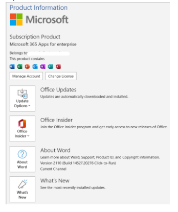 - Baseret på emnet for dit indlæg ser det ud til, at du brugte en Outlook-app. Hvad er din Outlook-appversion? Gå til File>Account, tag et skærmbillede af Produktoplysninger, som vist nedenfor.