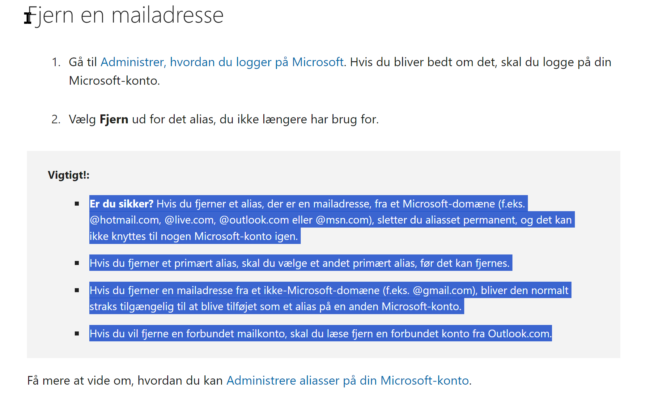 Hvis dette indebærer at have fjernet den "gamle" e-mail-adresse som en "alias" e-mail-adresse på kontoen, er handlingen med at fjerne en alias-e-mail-adresse desværre både øjeblikkelig og permanent. Når aliasadressen er fjernet, kan den under ingen omstændigheder overføres. Der er ingen undtagelser fra denne Microsoft-politik