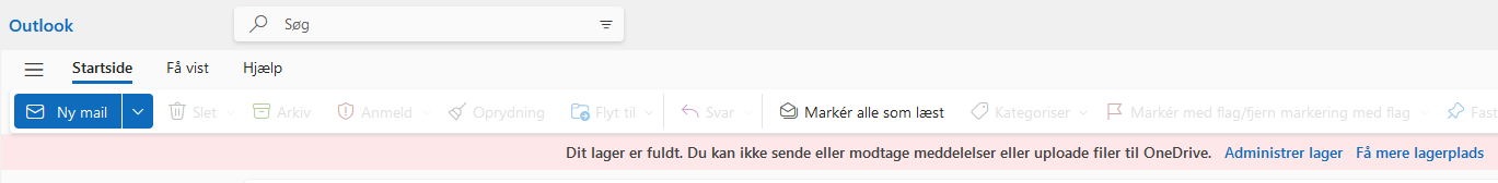 Du har muligvis overskredet mængden af 50 GB lagerplads, der er tilgængelig i OneDrive til mailen.