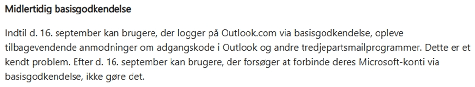 Hvis Outlook er konfigureret til at oprette forbindelse til Outlook.com ved hjælp af POP eller IMAP, understøttes moderne godkendelse ikke. Det betyder, at der ikke oprettes forbindelse, hvis grundlæggende godkendelse er helt udfaset.
