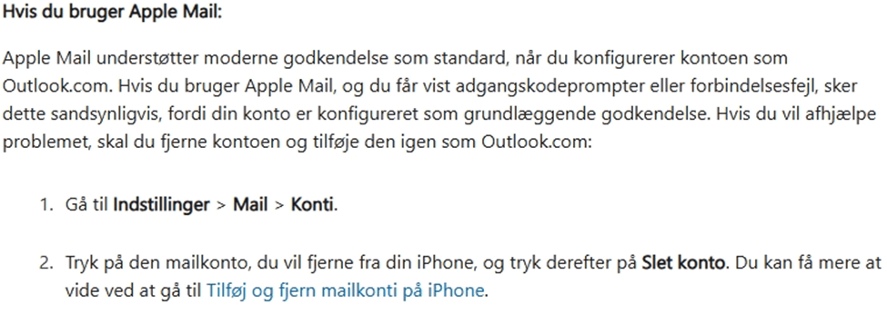 Hvis du får vist anmodninger om adgangskoder eller loginfejl i Apple Mail, kan din konto være indstillet til Grundlæggende godkendelse. Du kan løse dette problem ved at slette kontoen og tilføje den igen som en Outlook.com.