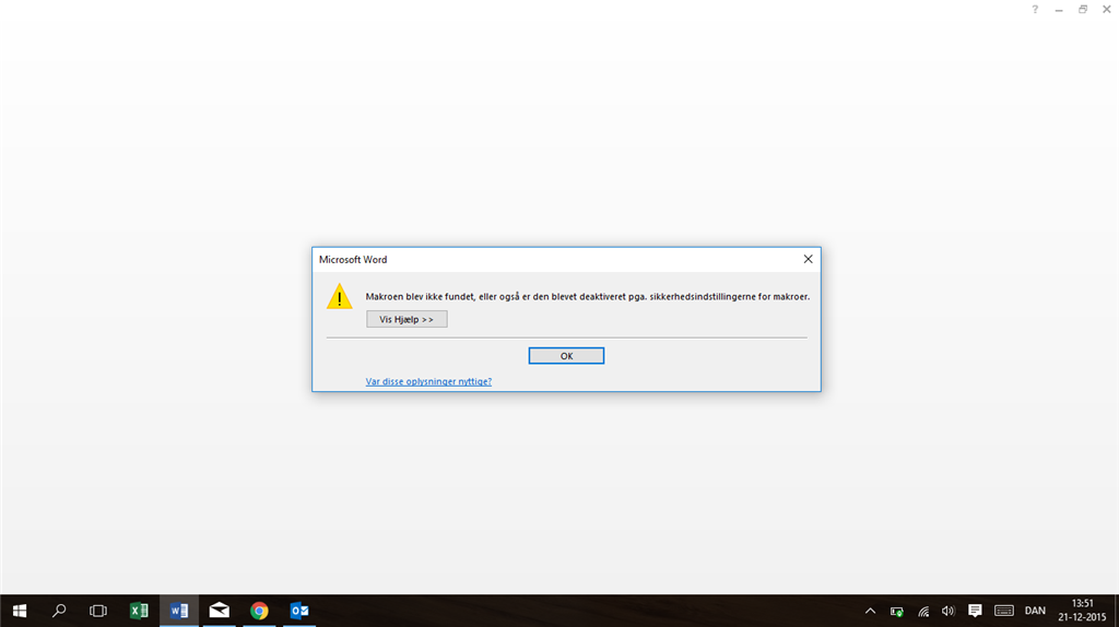 Bemærk: Hvis du kan arbejde videre normalt, efter at du har klikket OK i dialogboksen med makro-fejlmeddelelsen, vil der sikkert ikke være noget problem i det, medmindre den makro, der ikke kan findes, skulle lave noget uundværligt. Problemet bør selvfølgelig løses.