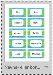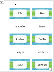 Hvis du gerne vil bruge layoutet, kan du evt. gøre noget i denne retning: Lav et stort billede ved at sammensætte baggrundsbillederne, så de passer med placering af de enkelte kort. Indsæt det billede i sidehovedet, så det kan danne baggrund for teksten, der skal stå i hvert "kort". Gå til selve dokumentindholdet, indsæt en tabel og tilret celler, så de passer med baggrundsbilledet. Skriv navn i hver celle - du kan centrere teksten i cellerne. Du kan også ændre det eksisterende design ved at ændre placeringen af alle de løse elementer, så de sætvis er placeret relativt til det tomme afsnit i hver celle i stedet for at være placeret relativt til siden.