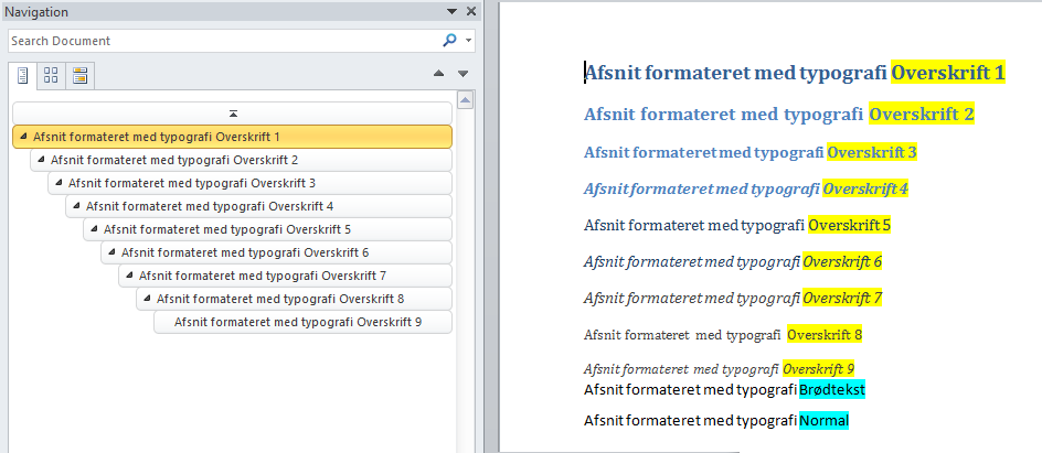 Navigationsruden viser alle afsnit, som er formateret med et af dispositionsniveauerne 1-9 (i modsætning til Brødtekst). De indbyggede typografier Overskrift 1-9 er defineret med dispositionsniveau 1- 9. Dermed vises alle afsnit, som er formateret med en af typografierne Overskrift 1-9. Desuden vises alle andre afsnit, som enten via den anvendte afsnitstypografi eller via direkte formatering er sat til et af dispositionsniveau 1-9.