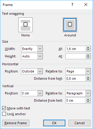 Nedenfor er vist en testopsætning i dialogboksen Tekstrude (her engelsk version) – læg mærke til Position > Outside, som bevirker, at tekstruden bliver placeret til venstre/højre på lige/ulige sider.