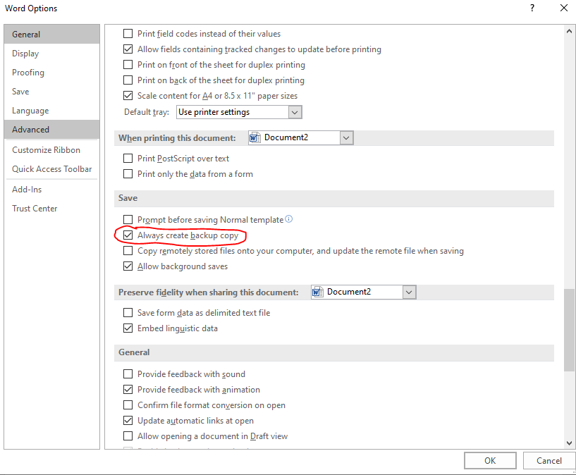 Word for Office 365, Word 2019, Word 2016 og Word 2013: Åbn Word, Vælg Fil, derefter Muligheder og derefter Avanceret. Rul ned til afsnittet Gem, og vælg Opret altid sikkerhedskopi.