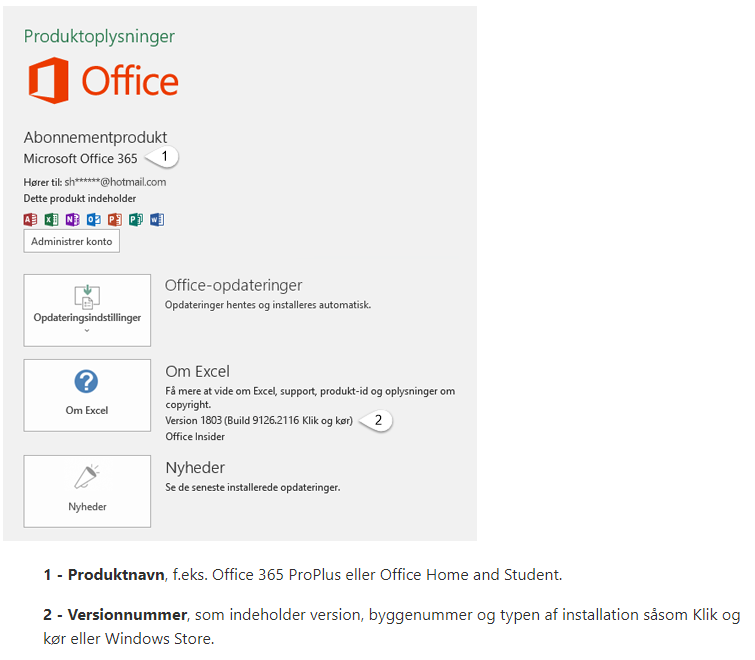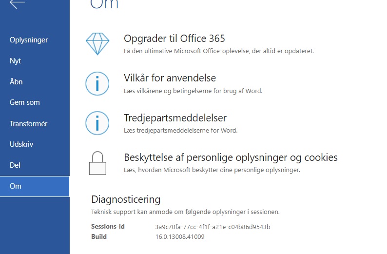 Hvilken version af Microsoft 365 har du? Hvis du åbner fx Word, vælger filer, ruller helt ned og vælger Om, så kommer versionen op og det vil jeg rigtigt gerne have et skærmbillede af.