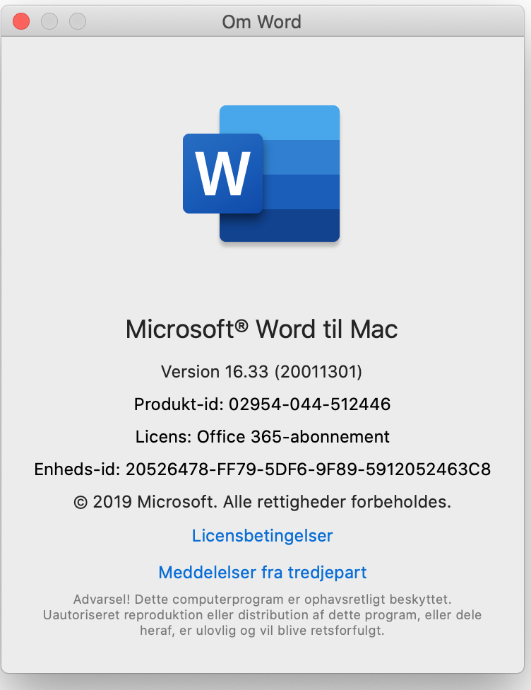 Har du en Office pakke, du har licens til som fx et engangskøb som Office 2016 til Mac eller har du et årligt eller månedligt abonnement på Office 365?