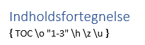 Indholdsfortegnelser, sidetal, referencer m.m. er felter i Word. Et felt indeholder instruktioner til Word om, hvad der skal vises. Du har blot fået slået til, at felterne viser felternes koder i stedet for deres resultat. Tast Alt+F9 for at vende tilbage til feltresultater.