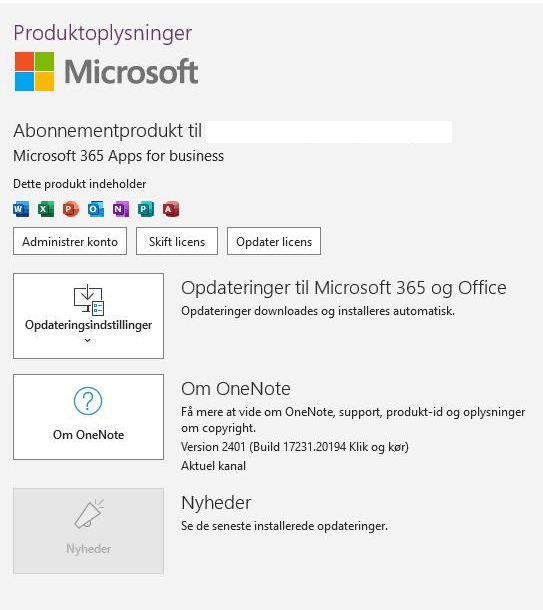 - Under Produktoplysninger finder du dit Office-produktnavn og i nogle tilfælde det fulde versionsnummer.