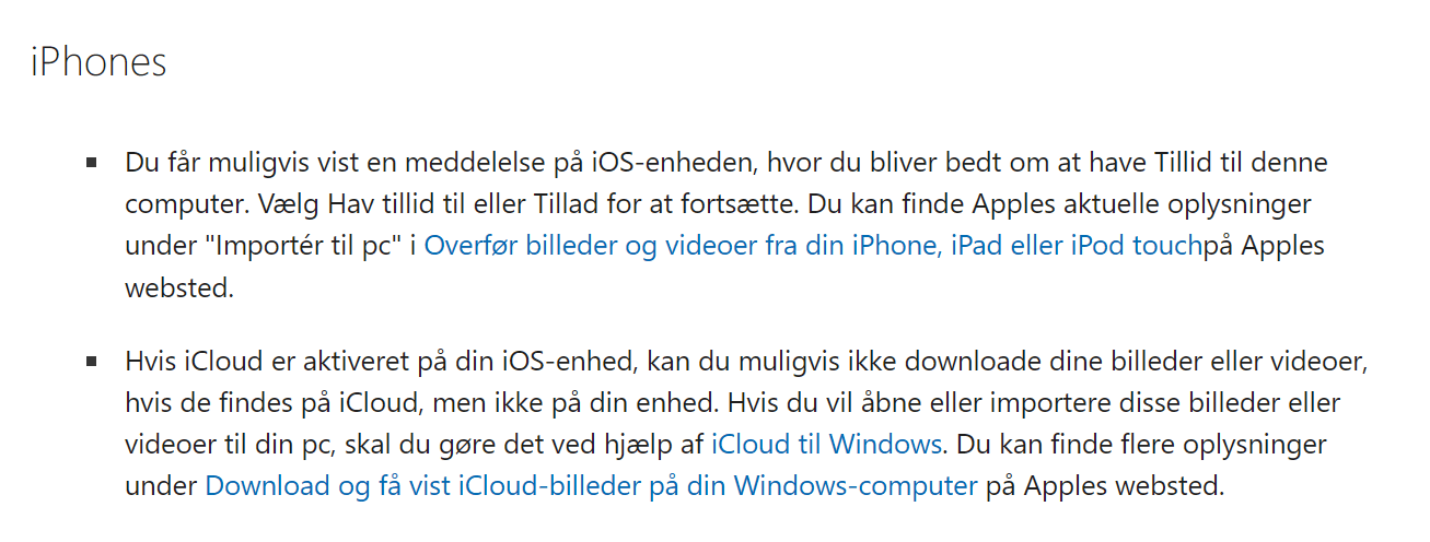 - Hvis du bruger iTunes til at overføre dine fotos, skal du sikre dig, at du har den nyeste version installeret. Alternativt kan du bruge appen Fotos på Windows til at importere fotos. Tilslut din iPhone, åbn appen Billeder på din pc, og vælg at importere. Her er en artikel, der kan hjælpe- Overfør fotos og videoer fra din iPhone eller iPad til din Mac eller pc - Apple-support (DK)