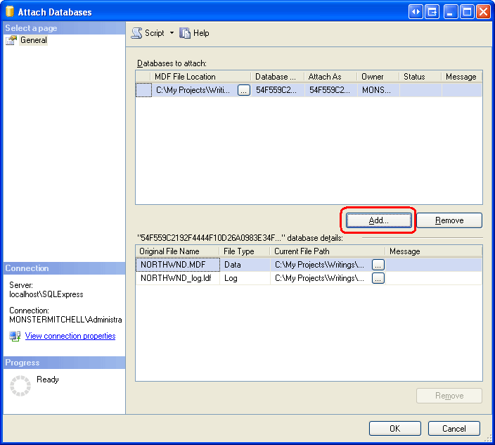 After connecting to the server, Management Studio will show the server and have subfolders for the databases, security, and so forth. Right-click on the Databases folder and choose the Attach option. This will bring up the Attach Databases dialog box (see Figure 2). Click the Add button and select the NORTHWND.MDF database folder in your web application s App_Data folder.