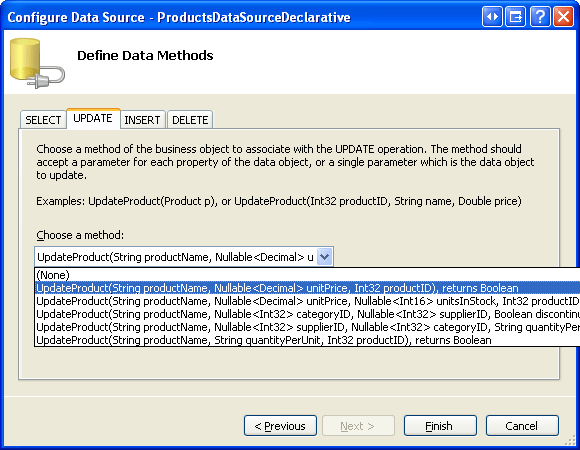 Configure the ObjectDataSource to use the ProductsBLL class and set the drop-down list in the SELECT tab to GetProducts(). In the UPDATE tab, choose the UpdateProduct overload with three input parameters - productName, unitPrice, and productID. Set the drop-down lists to (None) in the INSERT and DELETE tabs.