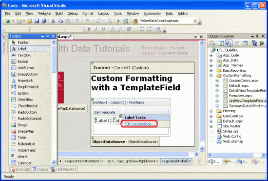 As you can see, the TemplateField consists of two templates an ItemTemplate that has a Label whose Text property is set to the value of the FirstName data field, and an EditItemTemplate with a TextBox control whose Text property is also set to the FirstName data field. The databinding syntax - <%# Bind("fieldName") %> - indicates that the data field fieldName is bound to the specified Web control property.