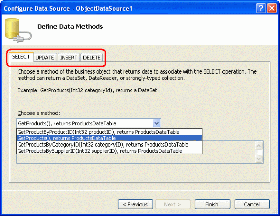 In the next screen we can specify what methods of the ProductsBLL class are mapped to the ObjectDataSource's Select(), Insert(), Update(), and Delete() by selecting the appropriate tab and choosing the method from the drop-down list. Figure 6, which should look familiar by now, maps the ObjectDataSource's Select() method to the ProductsBLL class's GetProducts() method. The Insert(), Update(), and Delete() methods can be configured by selecting the appropriate tab from the list along the top.